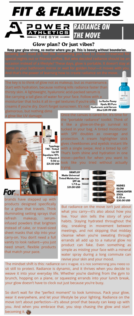 From gym to grind, your glow doesn’t clock out. This Fit & Flawless feature is all about maintaining that post-lift luminosity wherever life takes you — with hydration, movement, and mindset as your ultimate beauty essentials. Because real radiance isn’t about waiting for golden hour — it’s about carrying your light everywhere you go.